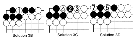 Solution 3C: After White has played the marked stone, Black can recapture with 2. Next, White fills in with 3, putting the stone at 2 in danger. Connecting that stone won't help Black.