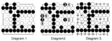 Diagram 2: What about Black? If he plays at 1, White answers with 2. If Black moves at 3, White plays at 4. In response to 5 and 7, White plays 6 and 8 to capture these two black intruders.