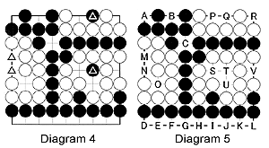 Diagram 4: Can't Black play the moves in Diagram 2, forcing White to play stones in his own territory? After the moves played in Diagram 2, the final position looks like this. The two stones (where the triangles are) on the left have been captured already, while the two marked black stones can't escape. On the other hand, White can capture them whenever he wants, so they are dead. Dead stones like these should be taken off the board at the end of the game after all moves have been played.