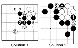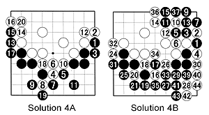 Solution 4B:There are many possible variations, but whatever happens, White has to block at 2. Many intermediate players know the tesuji (clever move) combination of 3 through 7, but it often backfires as shown by white 28. In the end, White wins by five points.