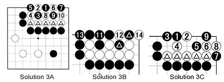 Solution 3A: After black 1, White should play at 2 and sacrifice one stone with 4, then clamp at 6. Black's strongest move is at 7. However, after black 9, White can either capture the ko (by playing where his stone has been taken at 2) or he can play at 10. Either way, the situation is ko, as you can see in the next diagram.