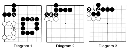 Diagram 2: Are all of the stones (in black group A in Diagram 1) necessary? What happens if we take away black A, B or C? The position on the right is changed so we do not have to be faced with life and death situations. Let's look at each of the situations where black A, B or C is not present.