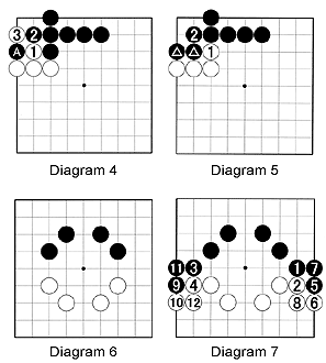 Now, try to visualize three-by-three territories to make nine points. In the corner, seven stones are needed, 11 stones on the side and 15 in the center. So, territory is most easily built in the corner, next along the sides and finally in the center.
