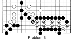Problem 3: The marked white stones have only one eye. To free them, White must capture the marked black stone. How does he do it?