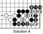 Solution 4: Black 1 is a nice placement in response to the marked white move. If White connects at 2 to save his stone, Black will cut with 3, then set up a loose ladder with the moves through 11. White 12 and 14 come too late. Black can put the white stones in atari with 15.