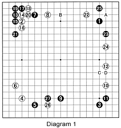 Diagram 1 (1-27): Until 9 there are no problems. It was possible for Black to play at 9 right away without first exchanging 7 for 8. This exchange actually involves an invisible ladder. See Reference 1. White 10 and 12 form an approach as well as a ladder breaker. That is the reason Black invades at 13, followed by the joseki (standard exchange) to 21. White then gets sente to first turn to 22 to reinforce his weakest group with 24. This is again sente as Black has to defend with 25 against an invasion at A.