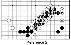 Reference 1: White likes to play at 1, but he is at a loss when Black wedges in at 2. The only way White can get a good result is by cutting and connecting with 3 and 5. However, at this point, Black can set up a ladder with 6. White 10 and 12 in Diagram 1 combine to break this ladder and it is the reason Black invades the corner with 13.