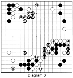 Diagram 3 (48-59): White 48 is a strong move. It safeguards the corner territory while attacking Black's eye-space while also inviting Black to cut at A, white 66, black 54. This would protect Black's stones, but such a meek approach is beneath Kobayashi. He completely ignores his attacker and presses with 49 through 53 to build influence in preparation for the coming center fight. 54 is White's follow-up, but in the end, he has to come back with 60 and 62. Black now grabs his chance to play, 63 and 65, which is a ladder breaker again. White has little choice but to submit with 66 and Black captures three white stones with 67 and 69. Black has completely deflected White's attack. In the end, he wins by just half a point.