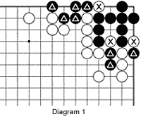 Diagram 1: We looked at false eyes last week. In this diagram, Black has only one real eye--the one in the corner. Black can capture the marked white stones and leave behind what look like eyes, but they are false. Unless he connects his marked stones to the main group, they can be taken. That means Black has to fill in the false eyes. Use a board and stones if you have trouble visualizing this.