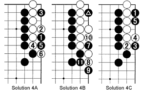 Solution 4B: Black 7 is the key move. Again White only has a false eye to show for his efforts. As you can see after black 11, the marked stone is at the right spot.