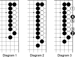 Diagram 3: Groups with a length of seven stones cause many problems. But generally, whether the group survives or not depends on who plays first. In this case, if White plays at 1, he can make two eyes.