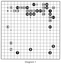 Diagram 1: Playing 6, which constitutes the Low Chinese Opening, is a rarely used strategy for White. However, in combination with expanding his framework with 10 and 12, the result seems reasonable. Black 13 is an interesting move as it could be followed by black 15 or black A. White decides the latter move, which could be followed by white B and black C, is more dangerous, and plays 14 to prevent this. However, black 15 is the vital point for attacking the white formation on its right. After black 19, white 10 and 12 are under attack. White 22 is a difficult move to assess; it seems to do hardly anything but it did provoke black 25, leading to the sequence through 31. Norimoto Yoda, the current Meijin and official commentator, said that after white 30 it felt as if Black was fighting with a hole in his stomach. If 17 had been at D, Black's shape might have been justified. Instead of 25, Black perhaps should have played at E. Still, White is under attack on the right side. How does he cope? Yamashita came up with the combination 32, 34 and 36. These moves are backed up by considerable reading of the board. See Problems 1 through 4.