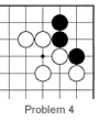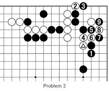 Problem 3: In response to the marked white stone, black 1 looks reasonable. However, if White plays at 2, Black cannot stop him with 3. If he tries, White will play 4 through 8. Black 9 is forced. How can White capture a few black stones?