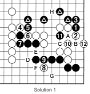 Solution 1: Instead of connecting his stones with a move at 4, which he did in the actual game, Yamashita could have tried to kill with 1 and 3. However, white 4 through 8 are a strong response, creating weaknesses in Black's position.