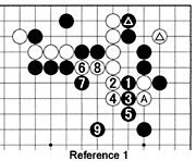 Reference 1: Official commentator Norimoto Yoda suggested black 1 in response to white A. The sequence through 9 would most likely follow. This would make the exchange of the marked stones a bad one for White as his stone would die without compensation. This was Black's only chance in this game, Yoda said, although he doubted that this would give Black the upper hand.