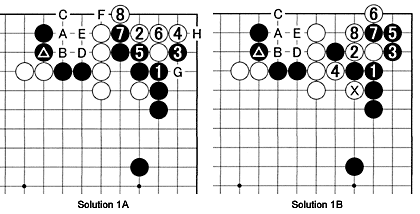 Solution 1A: If you were able to imagine the sequence after black 1, you are already quite strong. However, White is left with some problems after 8. Black can later exchange G for H, leaving White without enough eye space. Also the combination white A, black B, white C doesn't make an eye as in the game, because Black can play at D, if White answers at E, Black plays at F, leaving White with only one eye.