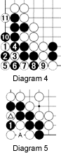 Diagram 4: Later on in the game, a double ko appeared in the lower left. This is not an accurate reproduction but the black corner stones are the same. With the sequence through 10, Black makes a double ko. Of course, Black will win this ko, but it is not necessarily advantageous, as we will see next week.