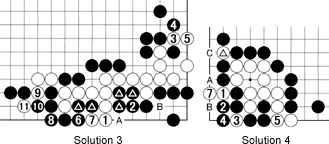 Solution 2: White 1 is a clever move. After white 5, Black cannot connect at 1 and A at the same time. Note that black 4 is necessary because White can cut there if Black connects at 1 and A.
