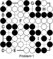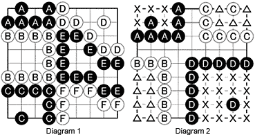 Diagram 1: To make things simple, all six groups are alive. Territory is formed by the spots that are completely surrounded by stones of the same color. So let's start counting. The A group has 2 points, the B group 6, the C group 5, the D group 8, the E group 5, and the F group 6. Therefore, Black has a total of 12 points (2 + 5 + 5), while White has 22 (6 + 8 + 6). White wins by 10 points.
