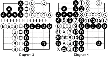 Diagram 4: After Black and White fill in all 17 dame points, something else becomes clear. The B group has a problem. If White does nothing, i.e. if he ignores white 16 and plays at 17, Black can attack the B group with 18. After black 22, neither White nor Black can fill in at A. So Black can't kill White and vice versa. This situation, a kind of standoff, is called seki. As territory is not counted in a seki, the marked points are zero points. Now, the margin is 20 - 5 = 15 points in Black's favor. As White lost all territory in the lower left corner, he is better off playing an extra move to defend his territory, e.g. by playing 17 at A or 18.