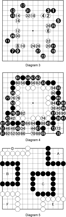 Diagram 1: This is a game between two beginners. Black plays conservatively on the 3-3 point while White ventures a little farther away from the corner to the 3-4 point. Black expands his territory with 5 and 7 and later with 9 and 11 but White just keeps defending his turf. In response to white 16 and 18, Black has to defend with 17 and connect with 19 to prevent 17 from getting cut off. Black now has 27 points against White's 29. So White wins. From the outset, Black played too conservatively.Diagram 2: After only five moves, Black occupies three corners while White has one. White keeps expanding and defending his corner, but cannot compete with Black. White ends up with 20 points while Black has 35 points. It is obvious White did not use his stones efficiently.