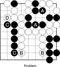 1. All groups are alive, so the only problem is in the upper right corner, which is seki (standoff). Black has four points (A, B, C and D), while White has 3 points (E, F and G).