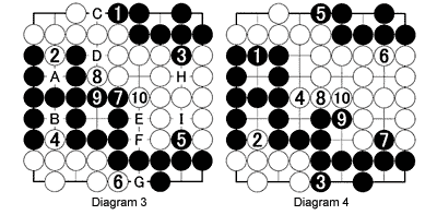 Diagram 3: So what happens if each player prevents his opponent from making additional territory? That is what happens up to move 6. Notice that neither black nor white groups in the center have two eyes. Black sets out to make eyes with 7. White 8 takes away a point before making one with 10. A through I are dame points. Both players end up with five points.