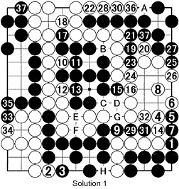 Solution 1: Black 1 is the best sente move. In other words it requires a response. However, White can get away with 2, which Black must answer with 3 or die, before switching to 4. Black keeps the initiative. Black 9, white 10 and 12, black 15, 17 and 19 are all sente. White 22 is also a kind of sente. However, Black ignores this move and plays at 23, 25 and 27, which becomes gote. This means Black loses the initiative. Black 37 is the last real point, leaving A through H as dame points. If Black plays at 1 first, he will win the game by about six points. If White starts, he should play at 1, which is worth about six points in reverse sente, making the game close. All moves referred to as sente are reverse sente for the other player. Some moves are more forceful than others as they threaten or gain more.