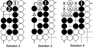 Solution 4: If Black plays at 1, he will capture the marked white stones and Black's territory becomes 10 points plus 5 prisoners = 15 points. If White plays at 1, he saves the five stones, and makes territory at the marked spots. This is worth three points while Black has only two points. So playing at A is worth 16 points (15 points for Black and one point for White). However, playing here is gote.