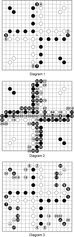 Diagram 1: Even if you're not a beginner, this might be an interesting position to start from. Since the positions are symmetrical, both parties should end up with similar territories. Or do they? Black 1 tries to increase his own territory while reducing that of White. If White answers with 2, Black will play 3, 5 and 7, and each time White will have to answer these moves.