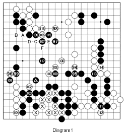 Diagram 1: After White invades the lower edge and ensures that his marked stones will live, Black defends with the marked stone. The game is very close. White forces 94 for 95 then expands the territory of his weakest group with 96. Black 97 forces White to defend with 98. White now has the chance to exchange A for B. After Black plays 105, White can exchange C for D and E for F, before Black falls back with 115. However, white 100 threatens 108, which would cut off Black's group in the lower right-hand corner. Black is quick to exchange 109 for 110 and 113 for 114 to avert this threat, then exchange 115 for 116 before switching to 117. This combination probably wins the game. And in retrospect, White's failure to make the A for B exchange is probably why he lost the game. The pros following this game looked into a host of alternatives with either White or Black winning by half a point, but in the end there was a ko worth one point that Black won as he had more ko threats. Some pros looked into the possibility of creating more ko threats earlier on to win that final ko, but in the final analysis it was doubtful White could have won. For the players, nothing is more painful for the loser and more satisfying for the winner than a half-point win.