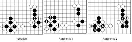 Solution: (Black 6 connects after the marked white stone is captured.) After creating a ko threat with 1 and 2, white 3 is a good move. If Black connects with 6, White finishes his ko threat with 7. This is better than the game where white 3 is located at A. In the solution, white 3 is better because he can next play at B to threaten the black stones.