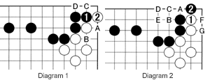 The difference between Diagram 1 and 2 is two points, but this will depend a little on white C in Diagram 1 and black F in Diagram 2. However, the point is that these moves are sente for both sides, so whoever plays first profits. But if there are more significant moves on the board, these moves will be sente for neither player.
