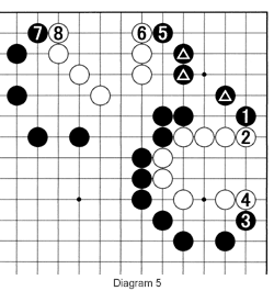 Diagram 5: With the marked stones in the same place, the situation is quite different. Black is strong and it is White who has problems. Black gets all the sente moves 1 through 8. Black's corner territory is about 18 points, while White's territory has shrunk. In this diagram and the previous one, the player who initiates the exchange keeps sente. So, that player gets something for nothing--a free lunch.