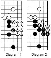 Diagram 2: If it is White's turn, he should play at 1. Black has no choice but to defend with 2, followed by the sequence to 8.
