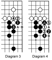 Diagram 4: If Black doesn't defend, White can capture the marked stone by cutting with 1. Black doesn't need to protect this stone because White cannot advance any farther than 3 or 2. But for the sake of argument, say Black tries to do this with 2, aiming at freeing his marked stone by playing at 5 himself. White can prevent that by playing at 3 before capturing with 5. Later on, the exchange white A, black B will be made.