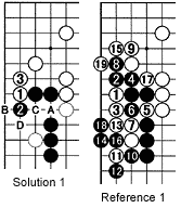 Reference 1: After white 1, couldn't Black resist with 2? Logically, the moves through 4 follow, but now Black is in trouble after white 5 and 7. In the sequence through 19 Black loses the capturing race.
