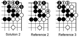 Solution 2: Although this move looks highly unlikely, black 1 is correct in most cases. If White is oblivious to any danger and plays at 2 and 4, black 5 will show how wrong White is. This sets up a ko for the entire corner, including White's marked stones. This is a serious situation for White.