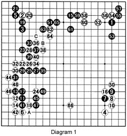 Diagram 1: (43 connects at 28) The moves through 14 are very unusual. White takes some territory while Black stakes out a huge position at the top. The sequence 19 through 24 also highlights the differences in the players' personalities. Black 25 is a common move and the moves through 33 seem natural. However, 34 through 40 are a good combination by White. Threatening to start a ko, Black plays 41. If White connects at A, black cuts at B and the ko starts. However, Black has a lot of ko threats at 42. That is the reason White plays there. Probably sensing a slight moral victory, Black next connects with 43 at 28, which he took earlier. This is too passive. He should have played at C, forcing White to link up at B. Black 63 concluded the game for that day. White 64 was the sealed move, which is naturally followed by Black's defense at 65. White 66 is a great move. Where should Black play next?