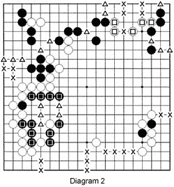Diagram 2: Let us first analyze the positions. Taking the examples from the book Positional Judgment: High-Speed Game Analysis by Cho Chikun, let's draw borders for each position , with X's for White's positions and the triangles for Black's. The rest is simple counting. Black then has 47+7+4=58 points against White 4+23+28=55+6.5 komi=61.5 points. White, therefore, leads by 3.5 points in terms of territory. What about weak groups? The white and black marked stones still are not alive 100 percent. However, White would not be able to increase his lower edge territory a lot by attacking Black's marked stones. Black has a lot of potential on the right because White's marked stones are weak as well. Next week, we will see how this game progresses.