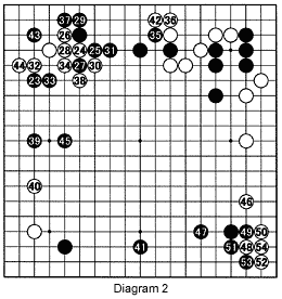 Diagram 2: It is strange how pros and teachers describe the same idea in different ways. Some say open up the board; others say make the board smaller. However, they both mean "play in an area where there are few stones." Black 23 conforms to this requirement. The move has two aims. It attacks White's upper left, and strengthens Black's stones on the upper edge. This leads to a long exchange to 39. Black seems to have the initiative and was leading because of the unusual 32-33 exchange. However, White 42 is a wonderful move, but the exchange 43-44 and the jump at 45 weakened White's group here. As White could not really defend the corner, he switched to the lower right to defend his right side.