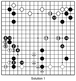 Solution 1: The marked stone on the right is Black's last move, which threatens to build a huge moyo. Try doing an accurate count at this point. Black's total territory is more than 50 points, while White's is just over 40. White first invades on the left, and in the sequence through 11, ensures life. With 14, Black is even forced to defend against cuts at A and B. Since his marked stones are strong, White does not need to defend, and he reduces Black's territory with 15 and 17. White is now clearly in the lead. What went wrong? We will have a look at that next week.