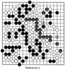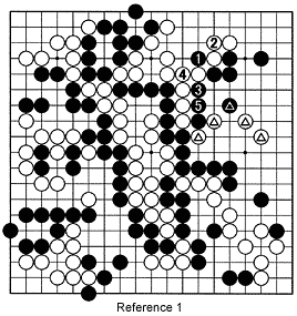 Black then starts an offensive on the right with 39 and 41. However, White takes the key point with 42. Black 43 through 47 is a clever combination, but White easily counters this and connects with 56. See Reference 1 and 2 to find out why. Black resigns at this point.