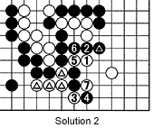 Solution 2: If Black plays the marked stone, white 1, 3 and 5 are a good combination. With 7, White captures two black stones and sets his marked stones free.