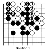 Solution 3: Black 1 is unexpected but correct. In response to 2, black 3 ensures life with two eyes (at the marked spots).