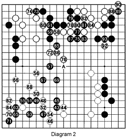 Diagram 2 (43-90): Black 43 and 45 are a standard technique for destroying frameworks. White will have to attack on a large scale to win the game, and does so with 48. White then proceeds to cut off the marked black stones and set up a huge territory in the center. However, Black gets sufficient compensation with 53 and 55. After 56, if Black succeeds in reducing White's framework, the game is over. However, Lee is famous for turning around games that appear to be lost. Moves 67 and 69 are good, and Black's victory seems assured. White 72 is a vague attempt to attack. If Black had played 75 at A, Black probably would have won the game easily. However, he slips up with 75. This move is unnecessary, and White thinks for a while before answering with 76. Black's attack ends when White ensures life with 90. Now, Black is left with a weak center group. Still, Black is leading in the territorial stakes. We will look at the rest of this game next week.