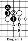 Diagram 1: The white stones make up a keima, or knight's jump. Although this formation is often used to attack, it has a weakness--it can be cut, especially if there are many hostile stones in the neighborhood. If Black has the marked stone in place, he can cut with the 1-3 combination. Usually the prerequisite for this cut is that the ladder white A, black B, white C, black D, white E, etc. is good for Black. In other words, if his cutting stone has an escape route, Black can cut with 1.