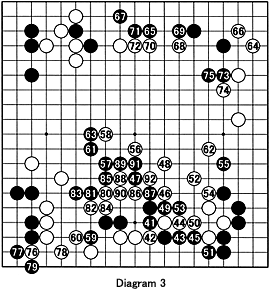 Diagram 3: Since the ladder is bad for Black, she defended with 43 and 45. White then started an attack in the center. However, after black 61 and 63 the attack fizzles out and White lands up in a bad position. However, White comes up with a great move at 80. Black 81 through 85 are bad moves as White was able to cut off eight stones with 86 through 92. This combination won Osawa the game and the tournament.
