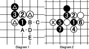 Diagram 1: The marked white stones form a keima, a shape often used in an attack. However, this formation also can be attacked through, for example, the 1-3 cutting combination when the marked black stone is in place. For this to work well, the ladder white A, black B, white C, black D, white E, etc. must be in Black's favor. However, this is not always the case.