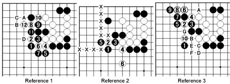 Reference 1: In response to black 1 (41 in Diagram 3), white 2 is a tsuke-koshi in combination with white 4. If Black tries to stop White's escape with 5 and 7, he runs into trouble after white 8, 10 and 12. If Black plays at A, white B sets up either C or D. Black cannot defend against both threats.